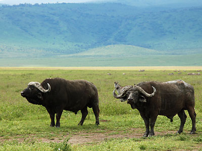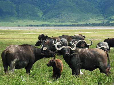Unsere Begegnungen mit Büffeln verliefen alle ganz friedlich. Während einer Wanderung im Arusha-Nationalpark trafen wir auf ein Muttertier mit Kalb, auch hier keinerlei Aggressivität.