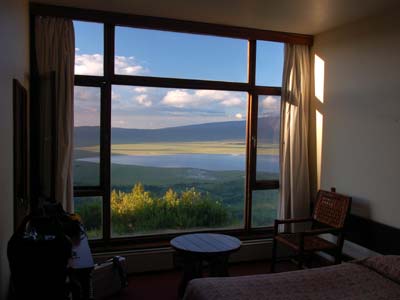 Der eindrucksvolle Blick von der Ngorongoro Wildlife Lodge in den riesigen Krater bleibt unvergeßlich, aber man hat relativ wenig davon, weil es abends schnell dunkel wird, und früh steckt man meist in den Wolken und sieht nichts.