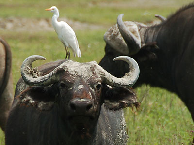 Oft sieht man auf dem Rücken der Büffel Vögel wie Madenhacker oder Reiher, die sich von Parasiten, Fliegen usw. ernähren.