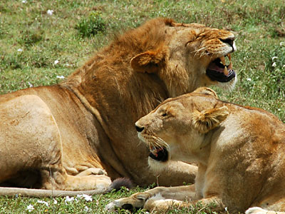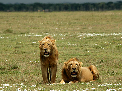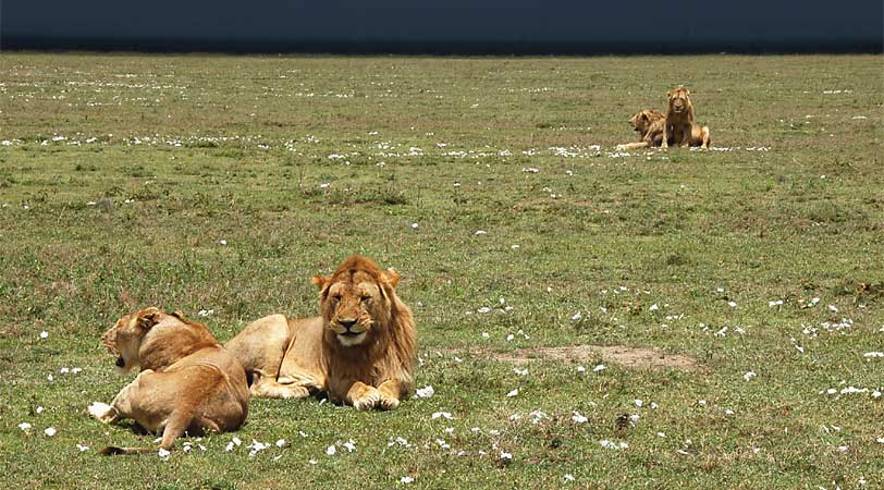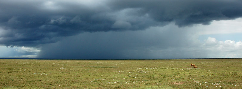 Dicke Regenwolken über der Savanne. Unser Fahrer entdeckt in der Ferne etwas: "Simba"