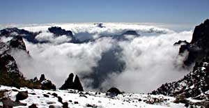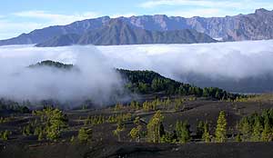 Zum Glück erreicht man den höchsten Berg der Insel, den Roque de los Muchachos (2426 m) bequem mit dem Auto. Hier kann man fast die ganze Insel überblicken und sich von oben die Ecke mit dem schönsten Wetter aussuchen. Und man sieht von oben die Wolkenfälle an den Rändern der Caldera. Gegenüber sieht man die Spitze des Pico Bejenado (1875 m), den ich ein Jahr zuvor erklommen hatte, und zwar zu Fuß.