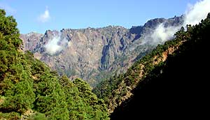 Die von Hella empfohlene Tauchbasis im Hafen von Tazacorte habe ich nie gefunden. Im Tauchertreff in Puerto Naos war laut Telefonansage wieder mal „eingeschränkter Tauchbetrieb“ (d.h. praktisch geschlossen), wie im letzten Jahr. Um in den Süden nach Fuencaliente zu fahren war es schon etwas spät. Also ließ ich mich vom strahlend blauen Himmel zu einem weiteren Wandertag verführen, diesmal in die Caldera. Da ich praktisch im „Abfluss“ des Kraters wohnte, war der Ausgangspunkt schnell erreicht.