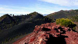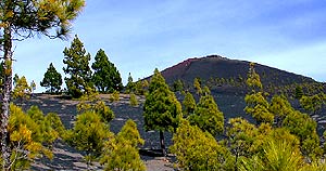 Leider war schon Mittag, sonst wäre es ein idealer Tag für die komplette Vulkan-Route bis El Pilar gewesen. Ich begnügte mich mit einem Aufstieg zum Vulkan Martin, wegen seiner Farbe auch "Roter Feuerberg" genannt. Allein der Weg ist ein Erlebnis: man stapft durch knirschenden schwarzen Vulkansand, wo die wenigen Pinien den unwirklichen Eindruck eher noch verstärken.