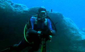 Vom ersten Tauchgang gibt es leider keine UW-Bilder. Ich wollte mich zunächst ohne Kamera um-schauen, und ich hatte sowieso genug mit mir zu tun. Mein Luftverbrauch war enorm, das Tarieren klappte nicht besonders, und der Einstieg über die glitschigen Steine wäre zu riskant gewesen. Immer-hin waren wir 42 m tief (was ich zu Hause seit Jahren nicht mehr gewagt hätte - im Meer kein Problem), schöne schwarze Korallen gesehen, am Ende noch eine Sepia aus nächster Nähe. Sehr schön, trotz Patrics berechtigter Kritik. Ich muß wohl mal wieder Tarieren üben...