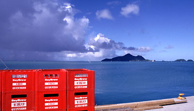 Auf dieses eindrucksvolle Erlebnis mußten wir an der kleinen Flughafenbar erstmal mit einem kühlen SeyBrew anstoßen. Und mit einem zweiten, dritten... Es gibt Momente im Leben, wo sich sowas ganz spontan ergibt. Möglicherweise haben wir den gesamten Vorrat des kleinen Ladens ausgetrunken, daher die leeren Bierkisten am Kai.