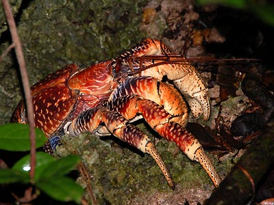 Dies ist die Kokosnuss-Krabbe, bekannt auch als "Palmendieb", weil sie/er angeblich Kokospalmen erklimmt, die Nüsse abschneidet und sie unten dann öffnet und leerfrißt. Nun, klettern können sie, aber das "Ernten" hat zumindest auf Chumbe Island, wo diese riesigen Krebse noch zahlreich vorkommen, noch keiner beobachtet. Das Öffnen einer Kokosnuss dürfte für den Krebs kein Problem sein. Lieber geht er aber an Küchenabfälle auf dem Kompost, erzählt der Ranger.