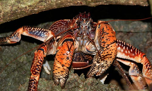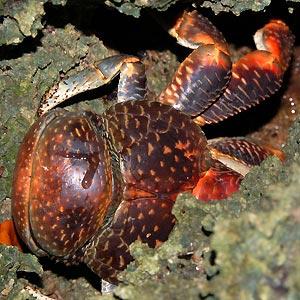 Dort suchen wir auch, finden jedoch nur "normale" Krabben und Einsiedlerkrebse mit ihren Schneckenhäusern. Im angrenzenden Wald werden wir dann schnell fündig, drei Exemplare auf wenigen Quadratmetern! Eigentlich sind sie nachtaktiv, aber in dem Dickicht ist es auch tagsüber recht dunkel, da fühlen sie sich wohl sicher - und und ich muß gnadenlos den Blitz einsetzen.